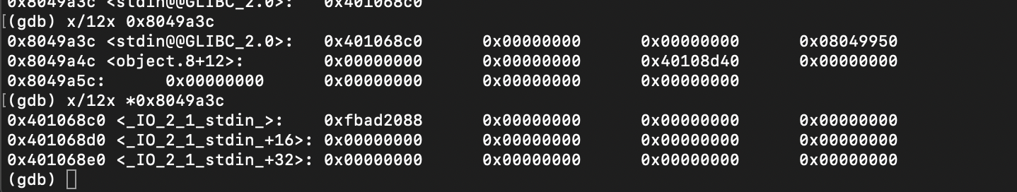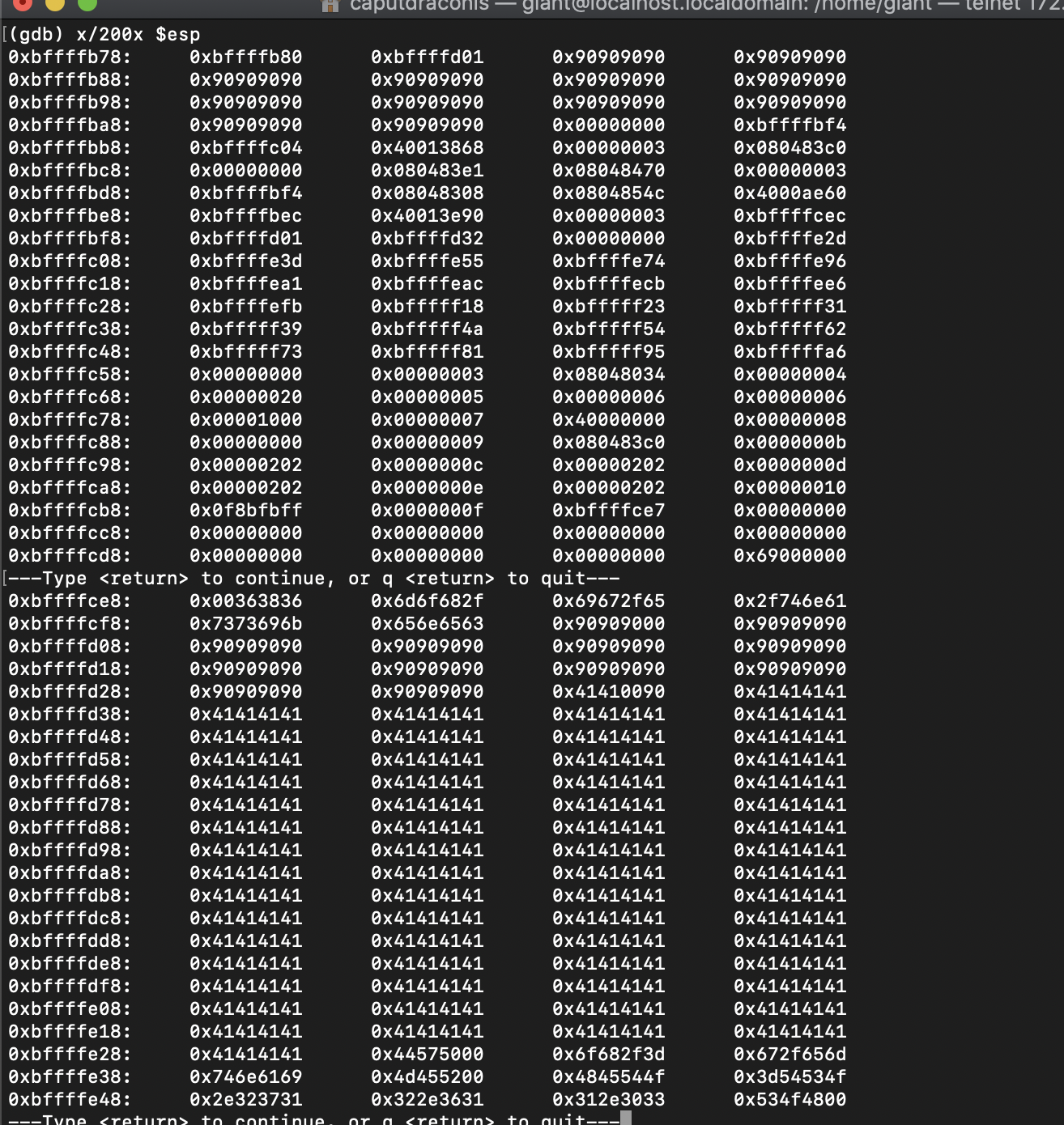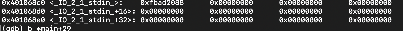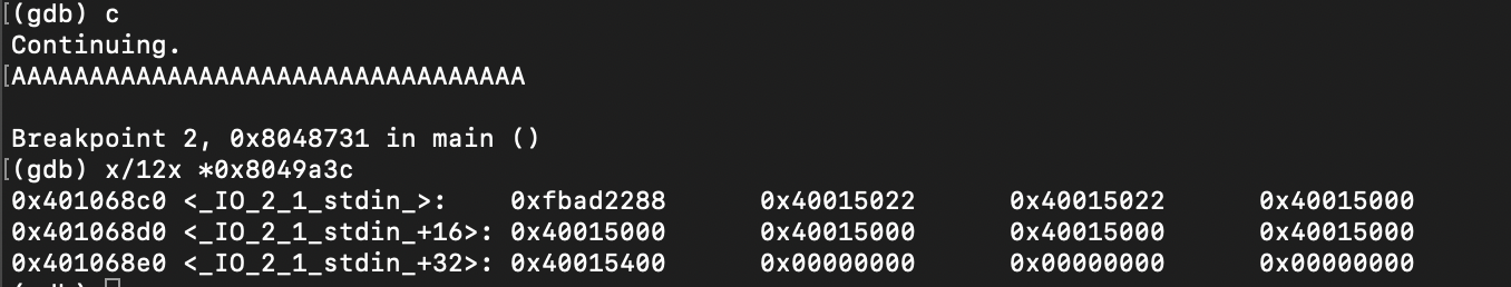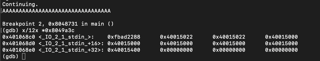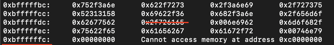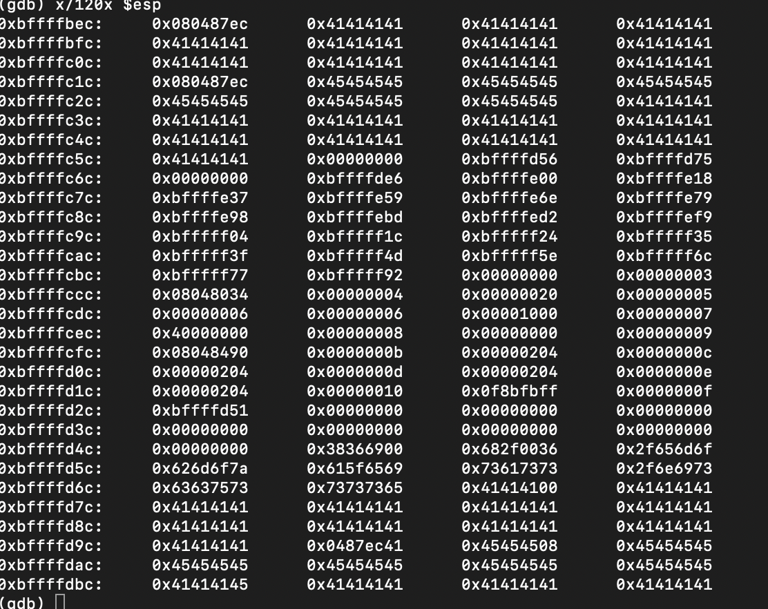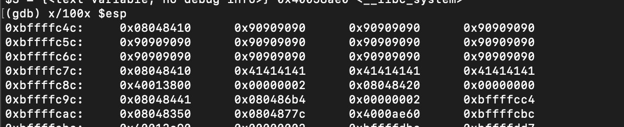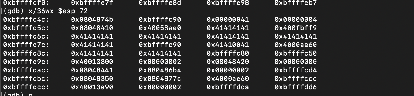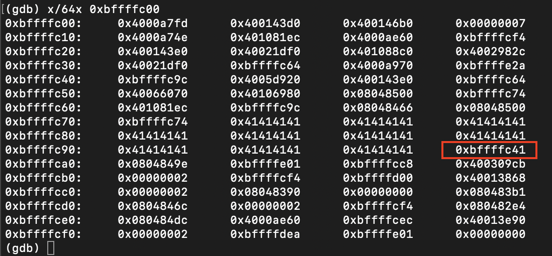ebp의 주소가 0xbffffc9c인데, 1바이트만 변조가 가능한 상황에서 우리가 EBP를 움직일 수 있는 공간은 0xbffffc00~0xbfffffff이기에 0xbffffc00부터 메모리를 출력해보았다.