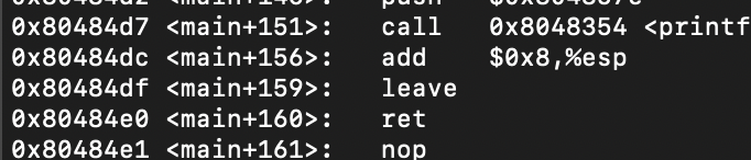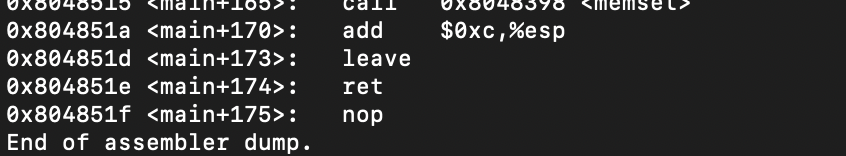 돌아온 메인함수는 나머지 맡은 일을 차곡차곡 수행하다가 서브함수와 마찬가지로 leave 명령어와 ret 명령어를 만나게 된다.