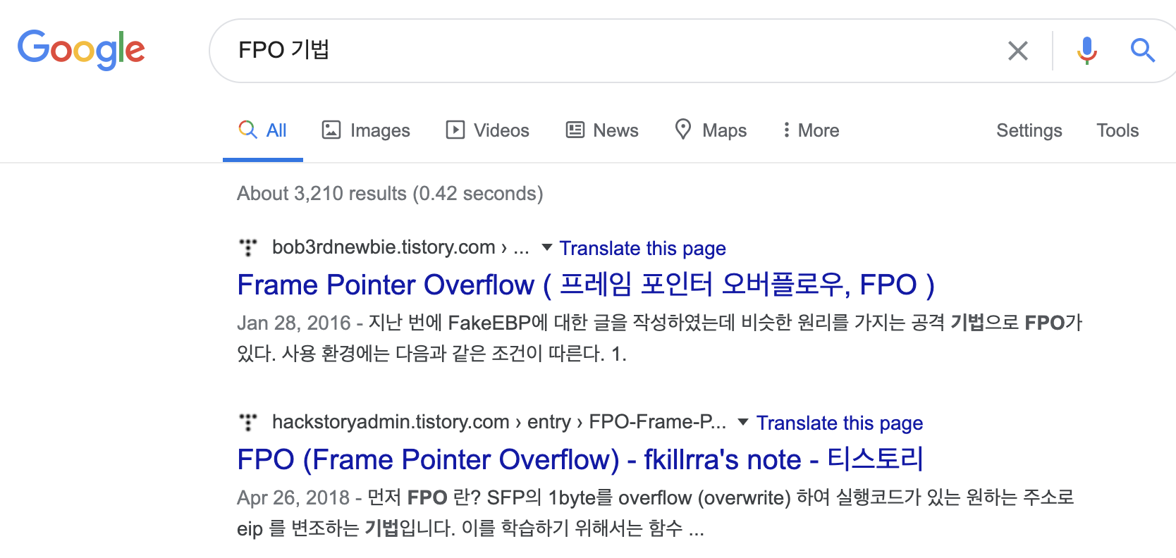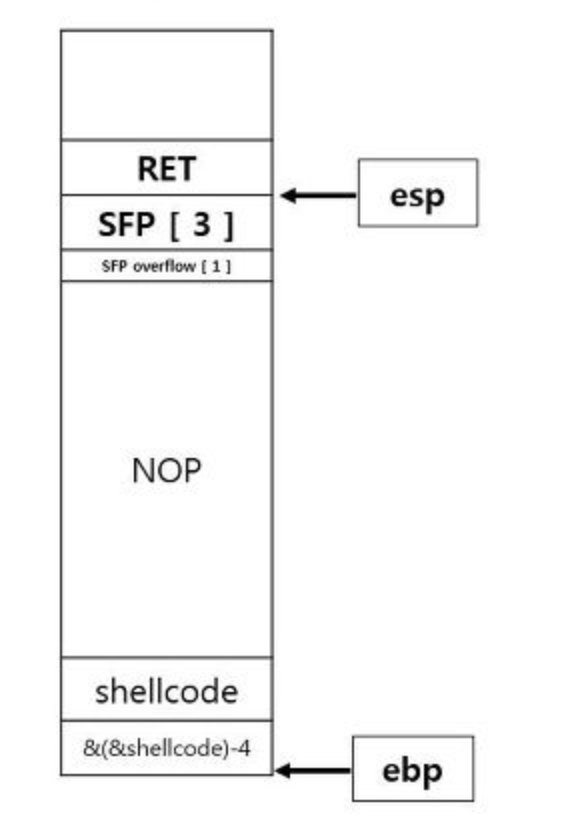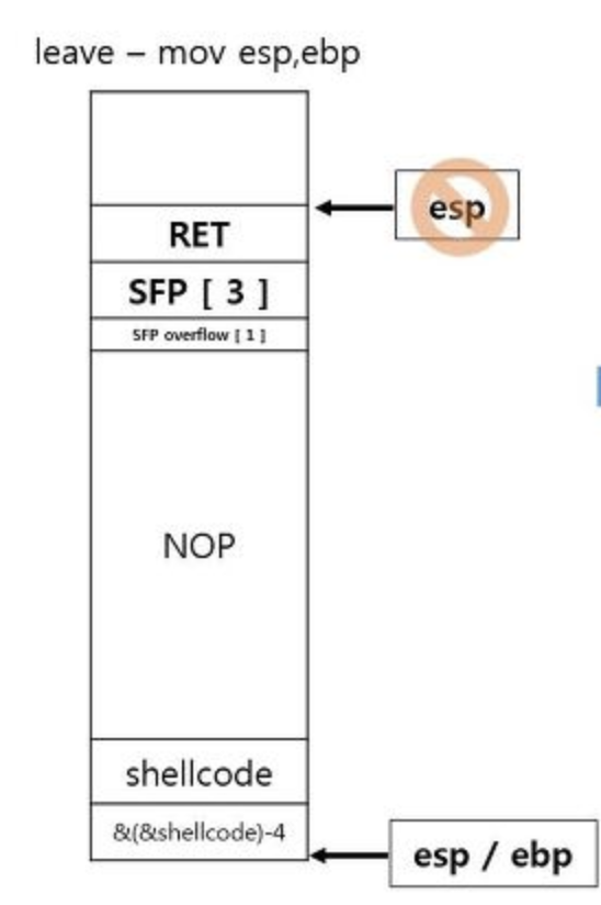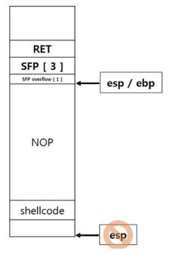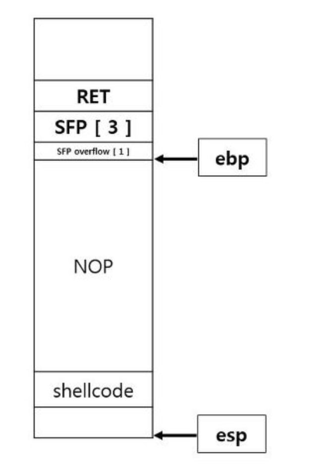 메인함수 외에 서브함수의 스택에서 EBP 영역을 1바이트만 오버플로우 되면 FPO 기법이 사용이 가능하다.