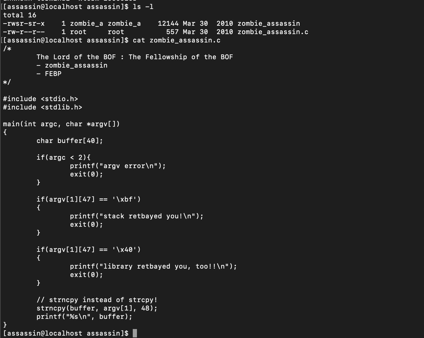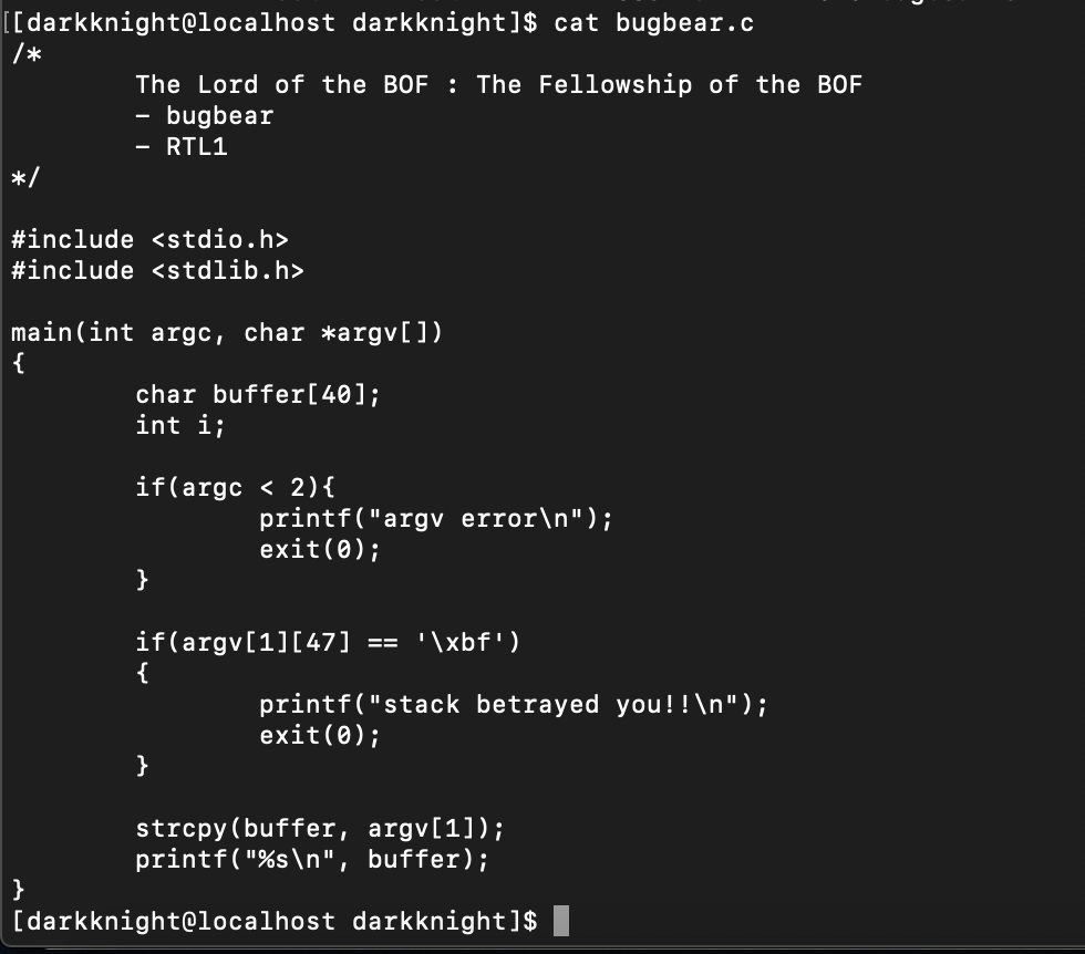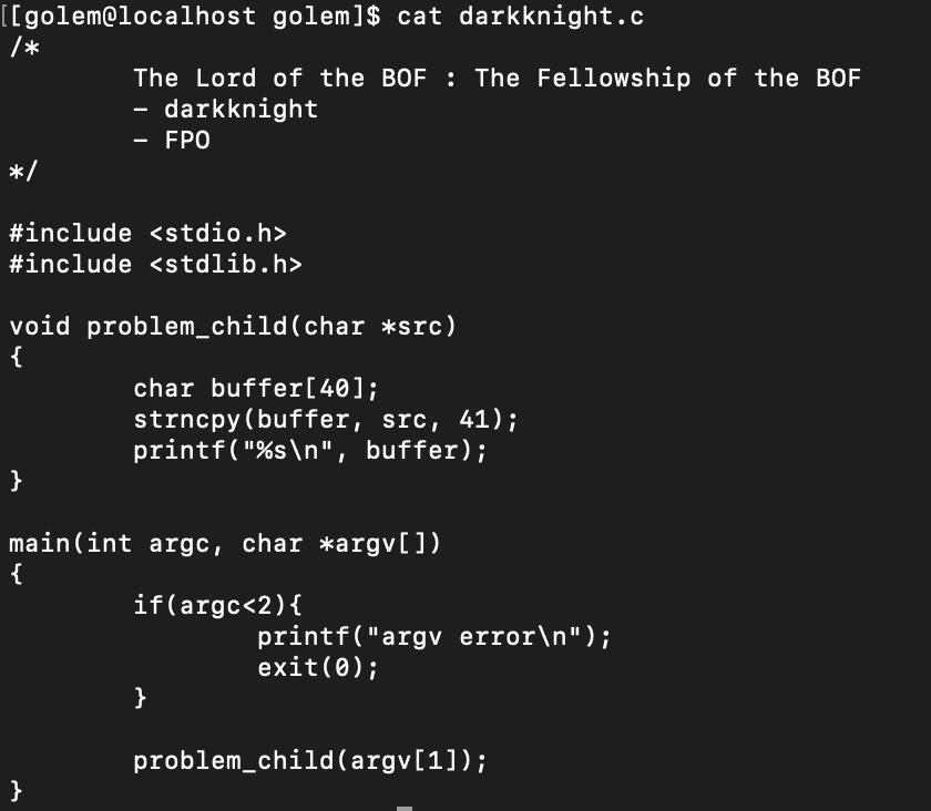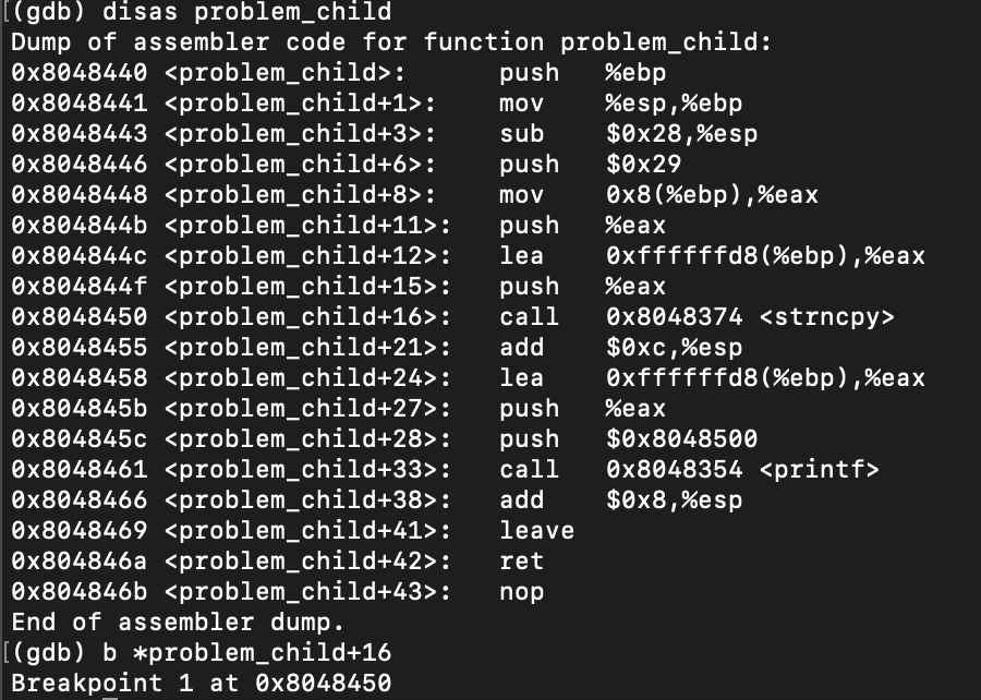 이번 문제에서는 신기하게 함수를 호출한다. 첫번째 인자로 주어진 문자열이 다시 인자로 들어가는 함수 problem_child()는 40바이트의 buffer를 선언하고, 인자로 전달받은 src를 복사해 buffer에 41바이트만큼 복사(strncpy)를 진행한다. 그리고 buffer를 출력한다.