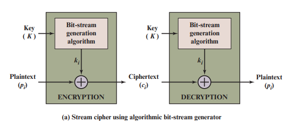 1. K(Key, 여기서는 Seed 역할)를 Bit-stream generation algorithm에 돌린다 => Plain Text와 길이가 같은 key stream이 생성된다.