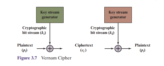 알파벳을 사용하지 않고 비트를 사용하는 암호화 방식입니다. c(cipher bit), p(plain text bit), k(key bit) 모두 0 또는 1을 나타내는 비트입니다. 아래의 식을 통해 작동 방식을 이해할 수 있습니다.