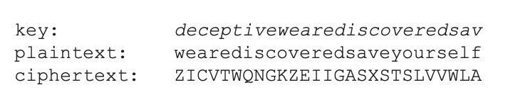 key를 정하고, 이를 plain text 에 더하여 치환하는 방식입니다. plain text의 길이가 key 보다 길 때, key를 여러번 반복하여 plain text와 같은 길이의 key를 만듭니다.