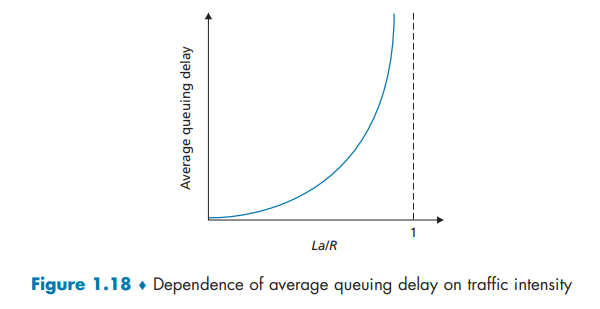 위 그래프는 Traffic Intensity 가 증가함에 따라 바뀌는 평균 Queuing Delay 를 표현하고 있습니다. 그래프와 같이 Intensity 의 작은 상승에 평균 Queuing Delay 는 급격하게 상승합니다.