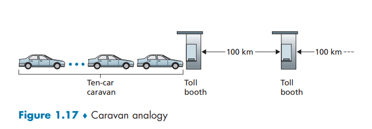 고속도로에 100 Km 마다 톨게이트가 있다고 가정해보겠습니다. 톨게이트와 톨게이트 사이의 고속도로를 링크, 톨게이트를 라우터라고 생각할 수 있습니다. 쭉 100 Km/hour 로 주행(Propagation)하는 차량이 있다고 할 때, 이 차량은 한 톨게이트로부터 다음 톨게이트까지 1시간이 걸리게 됩니다. 고속도로에 이런 차량 10대만 있으며 이 차량들은 서로 추월하거나 하지 않고 순서를 지키며 주행합니다. 이 차량을 Bit, 이 10대의 차량을 묶어 Packet 으로 생각할 수 있습니다. 톨게이트에서는 한 차량의 비용 처리에 12초가 소요됩니다(1분에 5대 처리). 마지막으로, 10번째 차량까지 톨게이트에서 비용처리를 완료할 때까지 앞 차량들은 모두 톨게이트에서 대기합니다. 그리고 마지막 차량이 비용 처리를 완료하면 다시 차량들은 그들의 순서를 지키며 출발합니다.