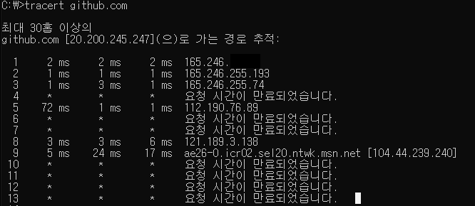 Github 로 실행해본 결과입니다. 여러개의 라우터를 거쳐가는 것과 그에 따른 지연시간을 알 수 있습니다.