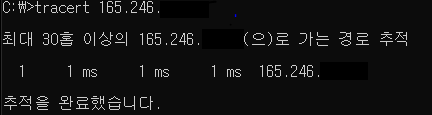 연구실 컴퓨터 환경에서 진행했습니다. 랜선으로 직접 이어져있는, 즉 Source 와 Destination 사이에 라우터가 없는 연구실 서버 IP 를 입력했을 때, 중간에 라우터가 없기에 곧바로 도착했음을 알 수 있습니다.