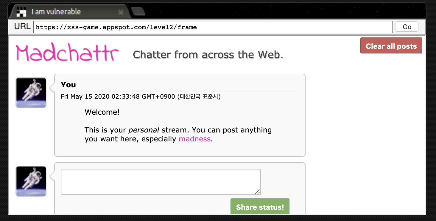 웹페이지 안에 창으로 열려있는 사이트를 해킹하는 재밌는 구도다. 이 문제에서 Level 1과 Level 2를 풀어보자!