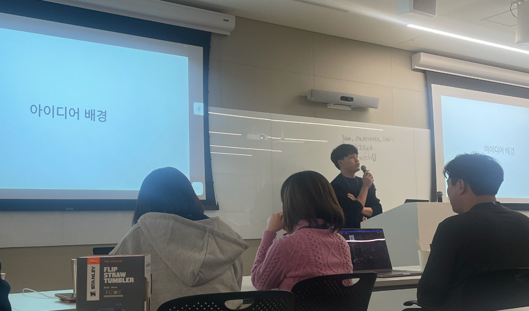 정말 빠르게 대본을 읽어가며 발표를 끝냈습니다. 다들 제 좋지 않은 발음을 알아들으셨을까 싶네요. 지난번 학교에서 진행했던 발표에서는 시연 영상을 보여드리지 못했었는데, 이번 발표에서는 시연 영상까지 추가했다는거에,, 저 혼자 만족하고 있습니다
