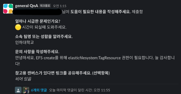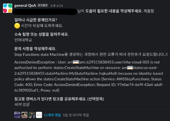 슬랙 워크스페이스의 기술 QnA 채널에 올라오는 대부분의 글은 IAM 사용자 권한 요청 글입니다. 제공 받은 IAM 사용자 계정은 S3, Lambda 와 같은 가장 많이 사용되는 서비스들에 대한 권한만 부여된 상태이며, 다른 서비스에 권한이 필요할 때는 위 사진과 같이 권한 요청 글을 올려 부여 받아야 합니다. 이때, 권한 요청 글을 작성하고 IAM 관리자가 이를 확인해주시기 전까지 학생들은 기다리기만 해야 합니다. 그러나 IAM 관리자 분이 워낙 바쁘셔서 바로바로 이런 권한 요청 글을 확인하실 수 없습니다.