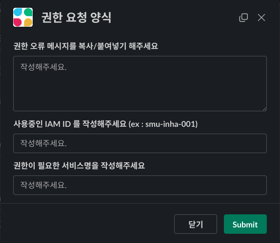 권한 요청 워크플로에 위와 같은 이모지 리액션을 달아서 현재 처리 상황을 알려줍니다. 사용자는 이 이모지로 자신의 권한 요청이 어떻게 처리되고 있는지와 처리 결과까지 확인할 수 있습니다.