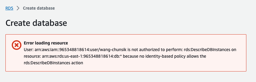 RDS 와 같이 권한이 부여되어 있지 않은 서비스를 이용하고자 할 때, 왼쪽 사진과 같이 Not Authorized 에러 문구가 뜨게 됩니다. 해당 에러 메시지를 복사해 오른쪽 사진의 워크플로에 입력하고 제출합니다.