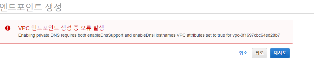 생성 시 아래와 같이 private DNS 확인 관련 오류가 발생한다면 Test-VPC의 설정에서 DNS 호스트 이름 편집에 들어가 DNS 호스트 이름을 활성해 주고 다시 엔드포인트를 생성하면 됩니다.