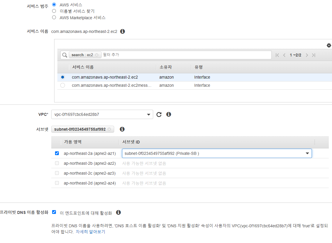 서비스 이름 : com.amazonaws.ap-northeast-2.ec2(위의 환경에서 실습할 때 EC2 endpoint를 기준으로 했기에 여기서도 ec2 서비스로 설정했습니다.)