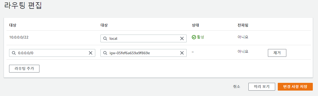 Routing : 0.0.0.0/0 인터넷 게이트웨이(Test-IGW)