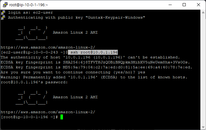 위에서 Public EC2에 접속해 있는 상태에서 Private-EC2의 프라이빗 IPv4 주소를 이용해 ssh 연결을 실행합니다.