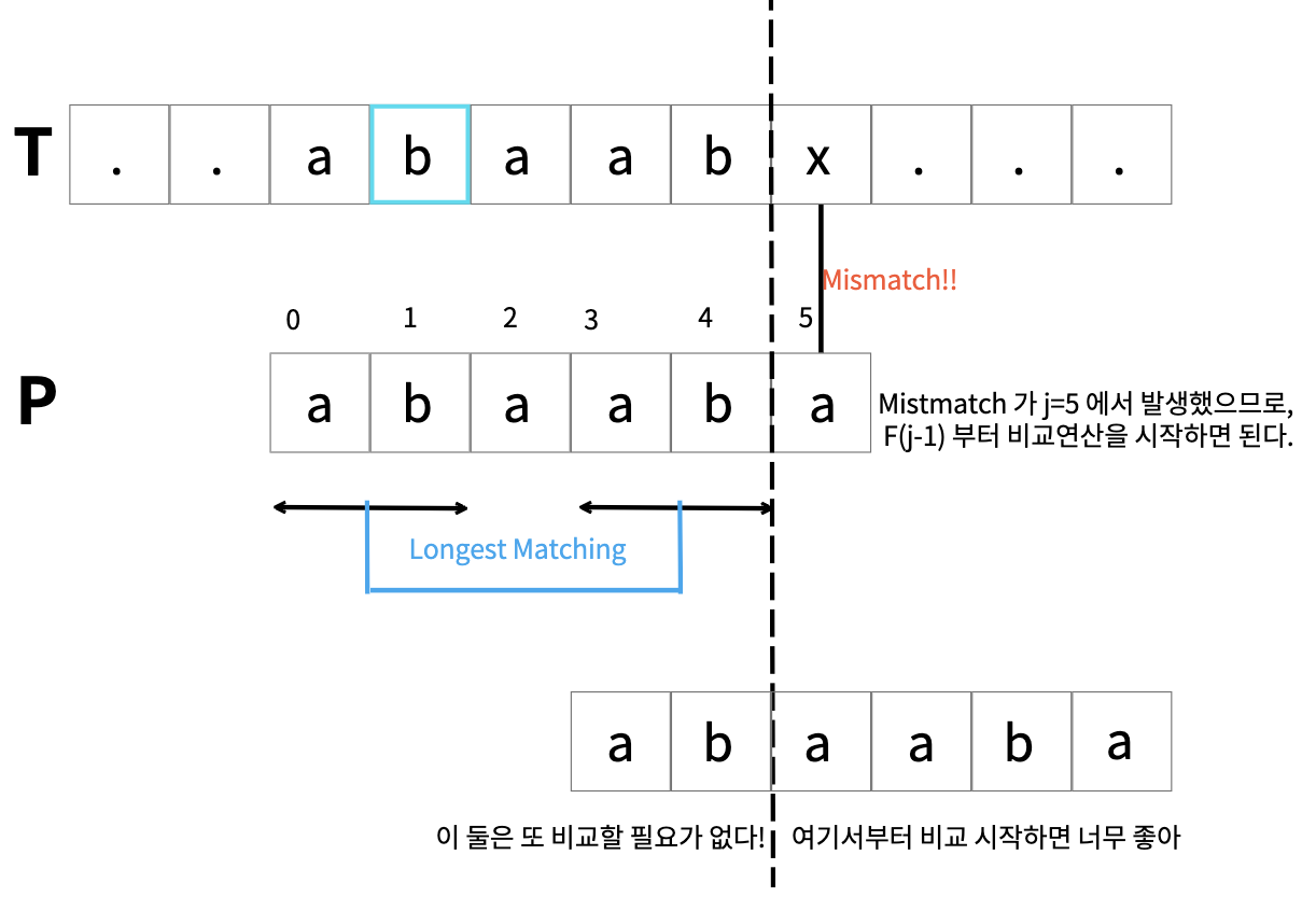KMP ์๊ณ ๋ฆฌ์ฆ์ ํจํด์ Preprocessing(์ ์ฒ๋ฆฌ) ํ๋ฉฐ, Mismatch ๋ฐ์ ์ ๋ช ์นธ์ Shift ํ ์ ์๋์ง๋ฅผ ๋ฏธ๋ฆฌ ๊ณ์ฐํด๋์ต๋๋ค. ์ด๋ฌํ ์์ ์ ์ํํ๋ ํจ์๋ฅผ failureFunction F(j) ๋ผ๊ณ ํฉ๋๋ค. ์ด ํจ์๋, P[0, j] ์ Prefix ์ P[1, j] ์ Suffix ๊ฐ ๊ฐ์ ๊ฒ๋ค ์ค ๊ฐ์ฅ ํฐ ์ฌ์ด์ฆ๋ก ์ ์๋ฉ๋๋ค.