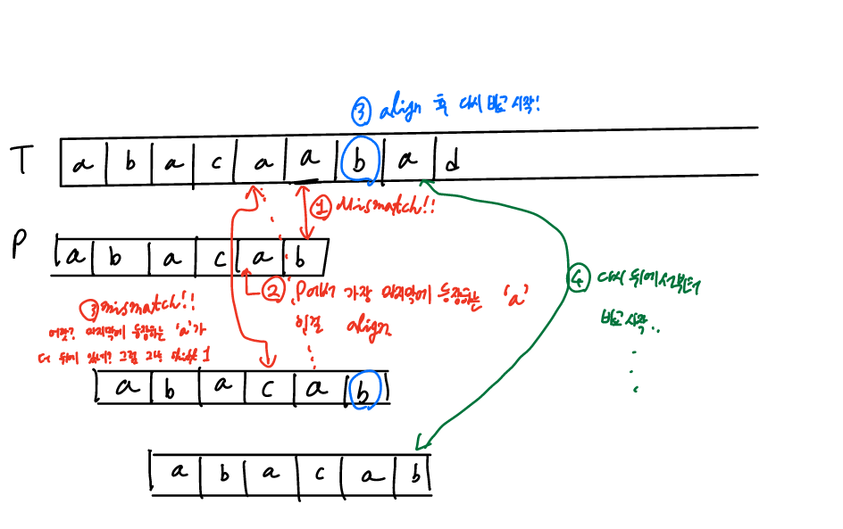 Text ์ index i ์์ Mismatch ๊ฐ ๋ฐ์ํ์ ๋, T[i] = c ๋ผ๊ณ ๊ฐ์ ํด๋ณด๊ฒ ์ต๋๋ค.