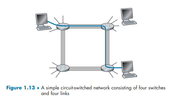 위 그림은 Circuit Switched Network를 표현하고 있습니다. 4개의 Circuit Switch 들은 4 개의 링크로 서로 연결되어 있습니다. 각각의 링크는 4개의 circuit을 가지고 있어서, 4개의 동시 연결을 지원할 수 있습니다. 또한 호스트(PC나 워크스테이션 등)는 switch에 하나씩 직접적으로 연결이 되어있습니다.