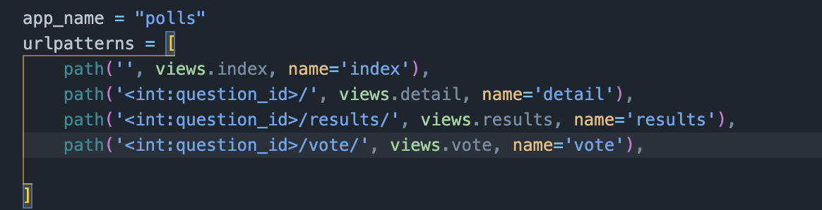 hardcoded된 url에서 벗어날 수 있었습니다. 근데 지금 추가되어 있는 앱 polls 뿐만 아니라 다른 앱들이 10개 부터 크게는 100개까지 추가되는 프로젝트에서 저 detail이라는 이름을 가진 path가 중복된다면, 장고는 detail이라는 이름을 가진 url중 어떤 url을 가져와야 될지 모르게 됩니다. 여기서 추가해야 되는게 app_name