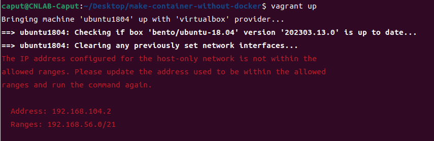 [Error] The IP address configured for the host-only network is not within the allowed ranges. Please update the address used to be within the allowed ranges and run the command again.