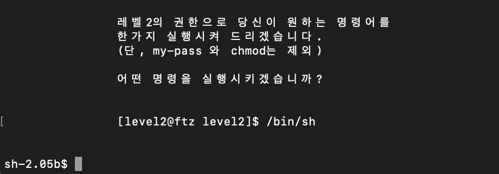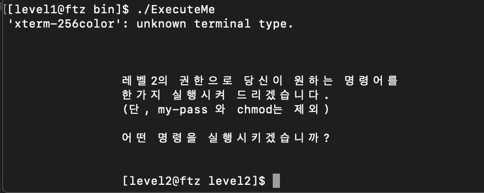 실행시킨 모습이다. my-pass(현재 계정의 PW를 알려주는 명령어)와 chmod(권한 변경 명령어)를 제외한 명령어를 level2의 권한으로 실행시켜준다고 한다.