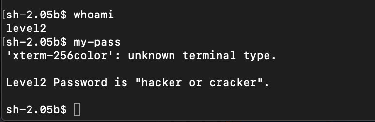 실행된 쉘에 whoami(현재 계정의 ID를 출력해주는 명령어)를 입력하니 진짜로 level2의 계정으로 되어있다. 그렇다면 여기서 my-pass 명령어를 실행시키면 level2 계정의 pw가 나온다.