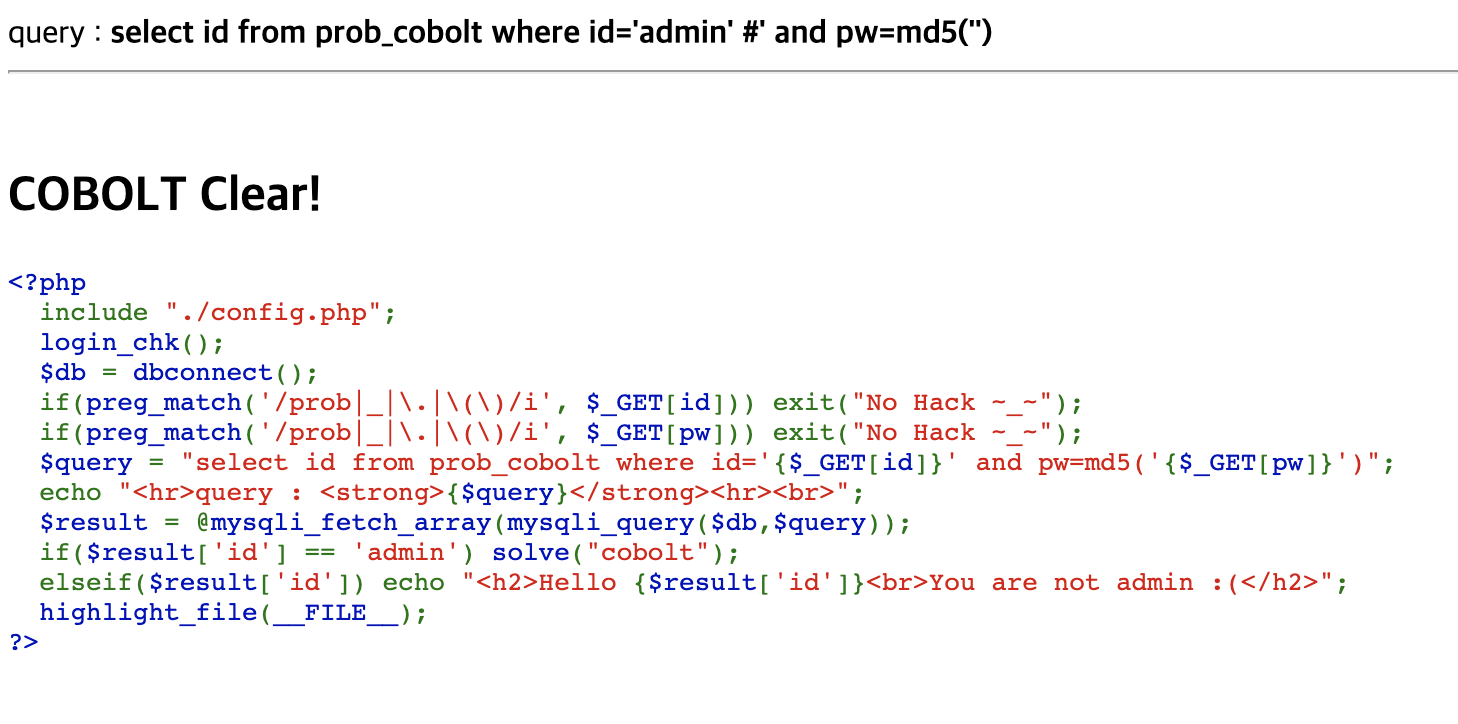 처음 노렸던 부분은,, 이전 gremlin 문제에서 했던 것과 똑같이 pw='1' or '1'='1'를 md5 decrypt한 버전으로 넣어서 md5 암호화를 진행했을 때 온전한 공격 쿼리가 되도록 해보려고 했다. 근데 온라인 md5 암호화 복호화 사이트에 저 값을 넣었을 때 기호는 되지 않는 것 같았다. 그래서! 다시 한 번 php 코드를 봤을 때 pw 값은 공격쿼리에서만 이용하고 뒤에서는 다시 사용하지 않는 것 같았다. 즉, pw 값을 따로 주지 않고 그냥 id가 admin이라는 것만 보여주면 $result['id']에 'admin'이 저장되고 그렇게 되면 solve('cobolt')다!