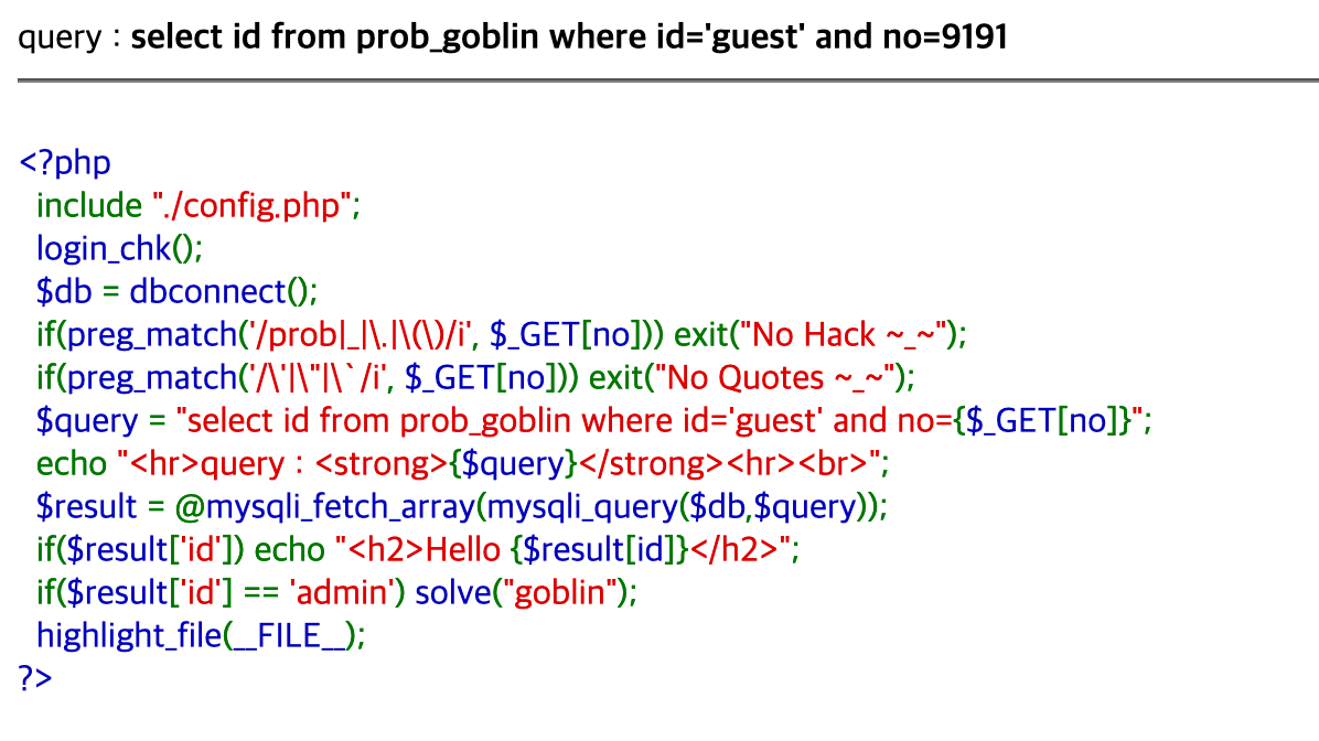 $query = "select id from prob_goblin where id='guest' and no={$_GET[no]}";