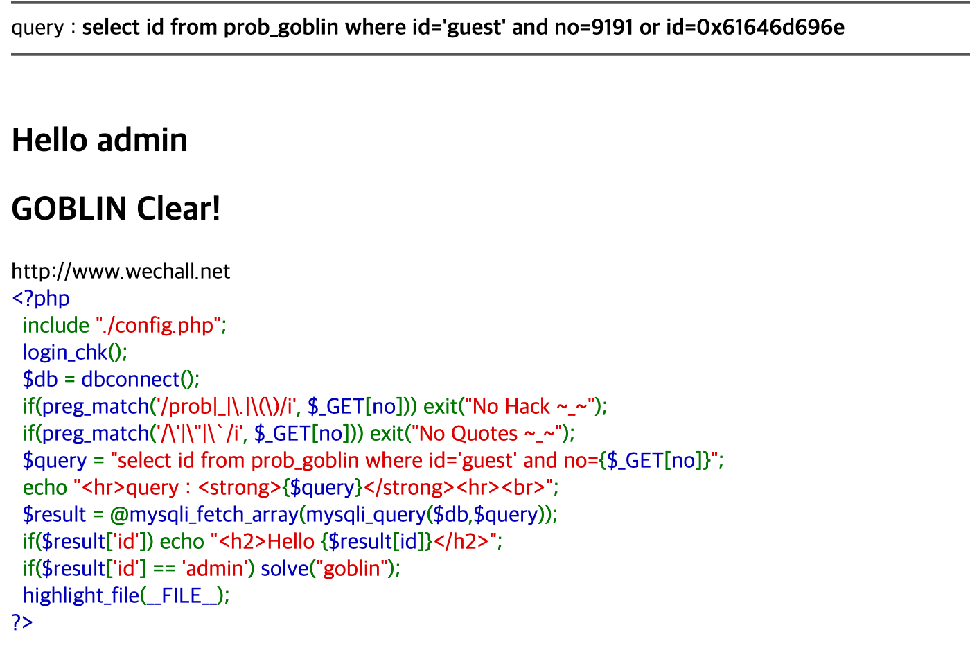그럼 앞에서 말했던 것처럼 일부러 틀린 no 값을 주고 뒤에 or id='admin'을 붙여주면 앞의 식이 무효화되고 뒤의 id='admin'이 본 식이 되면서 쿼리문은 select id from prob_goblin where id='admin'이 될것이다.