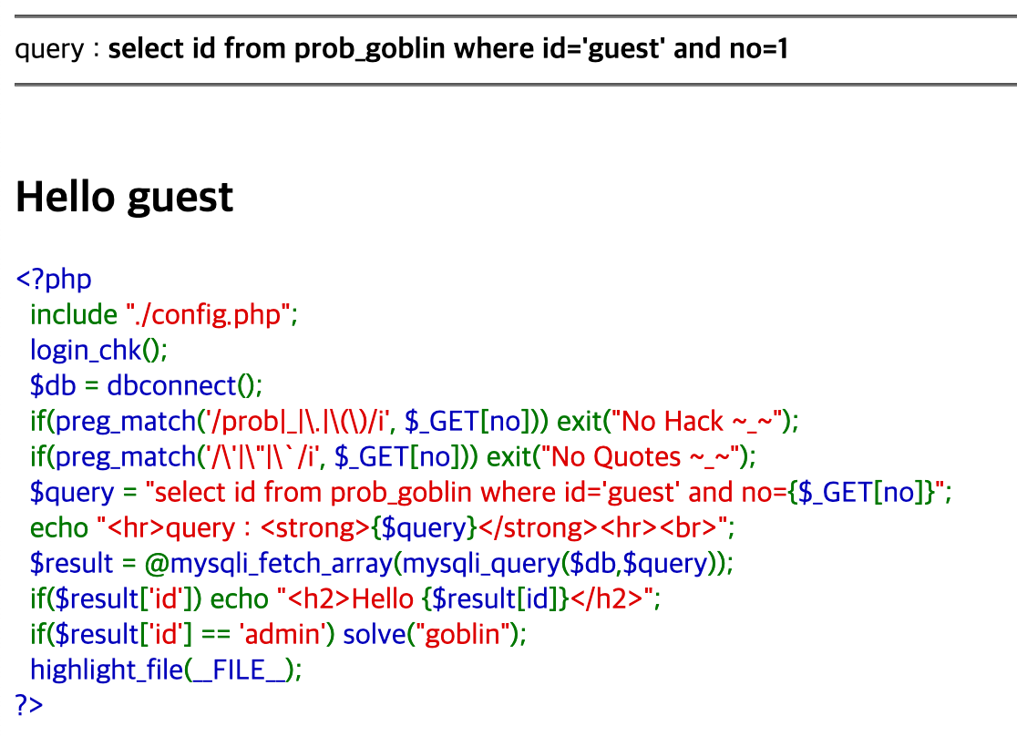 $query = "select id from prob_goblin where id='guest' and no={$_GET[no]}";