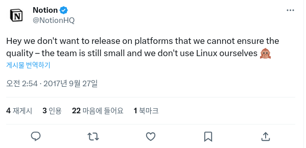 심지어 2017년에는 노션의 트위터(X) 계정에 아래와 같은 트윗도 올라왔네요