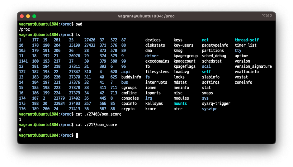 oom_score ๋ ํ๋ก์ธ์ค๋ค์ ๋ฉํ๋ฐ์ดํฐ๋ฅผ ๊ด๋ฆฌํ๋ /proc ๋๋ ํ ๋ฆฌ์์ ํ์ธํ ์ ์์ต๋๋ค. proc ์๋์๋ ์๋ง์ PID ๊ฐ์ ์ด๋ฆ์ผ๋ก ํ๋ ๋๋ ํ ๋ฆฌ๋ค์ด ์์นํ๊ณ ์์ผ๋ฉฐ, ์ด ๋๋ ํ ๋ฆฌ ์์ ์๋ oom_score ๋ผ๋ ํ์ผ์ oom_score ๊ฐ ์ ์ฅ/๊ด๋ฆฌ๋๊ณ ์์ต๋๋ค.