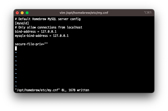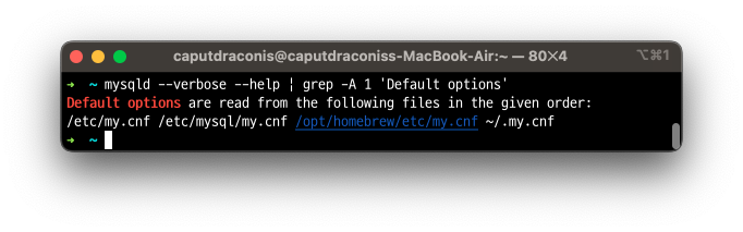 결과값으로 위 캡처본과 같이 출력됩니다. 저의 경우 4가지 파일이 나왔습니다. mysql 은 위 4가지 파일을 순서대로 스캔하면서 가장 먼저 있는 파일을 기준으로 설정하게 됩니다. 저의 경우에는 세번째 파일인 /opt/homebrew/etc/my.cnf 을 mysql 설정 파일로 사용하고 있었습니다.