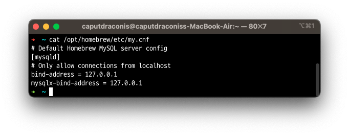 결과값으로 위 캡처본과 같이 출력됩니다. 저의 경우 4가지 파일이 나왔습니다. mysql 은 위 4가지 파일을 순서대로 스캔하면서 가장 먼저 있는 파일을 기준으로 설정하게 됩니다. 저의 경우에는 세번째 파일인 /opt/homebrew/etc/my.cnf 을 mysql 설정 파일로 사용하고 있었습니다.