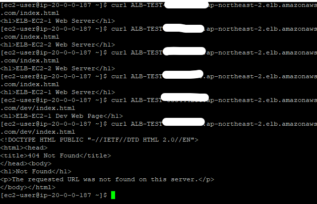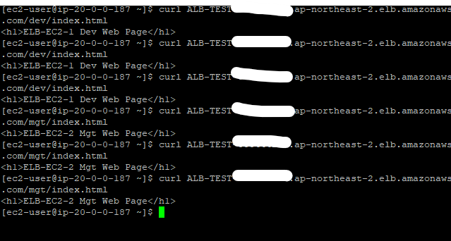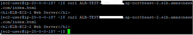 이제 My-EC2 인스턴스에 접속해서 ALB의 DNS 주소로 curl 명령을 통해 HTTP 접근을 해보면 ELB-EC2-1과 ELB-EC2-2로 번갈아 가면서 부하 분산이 됩니다.(기본적으로 ALB의 로드 밸런싱은 라운드 로빈 방식을 취합니다. 이는 변경 가능합니다.)