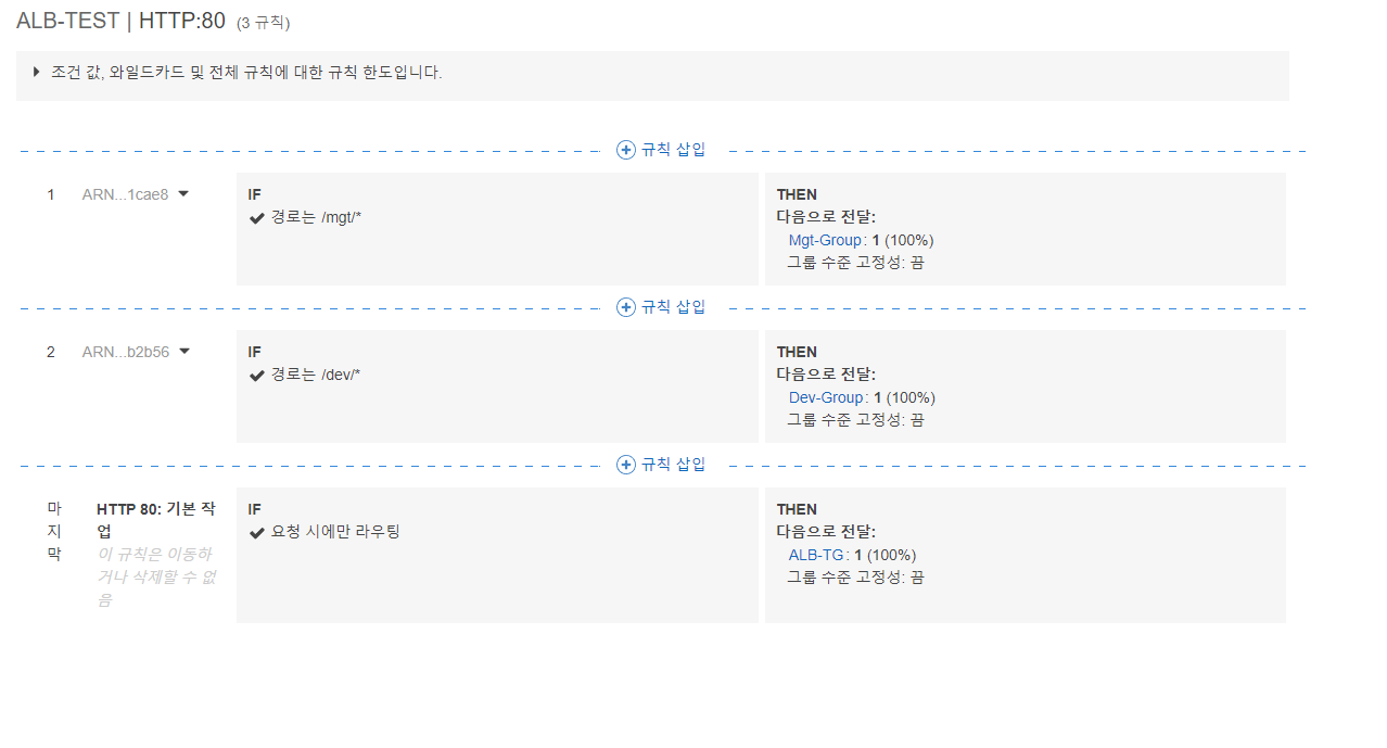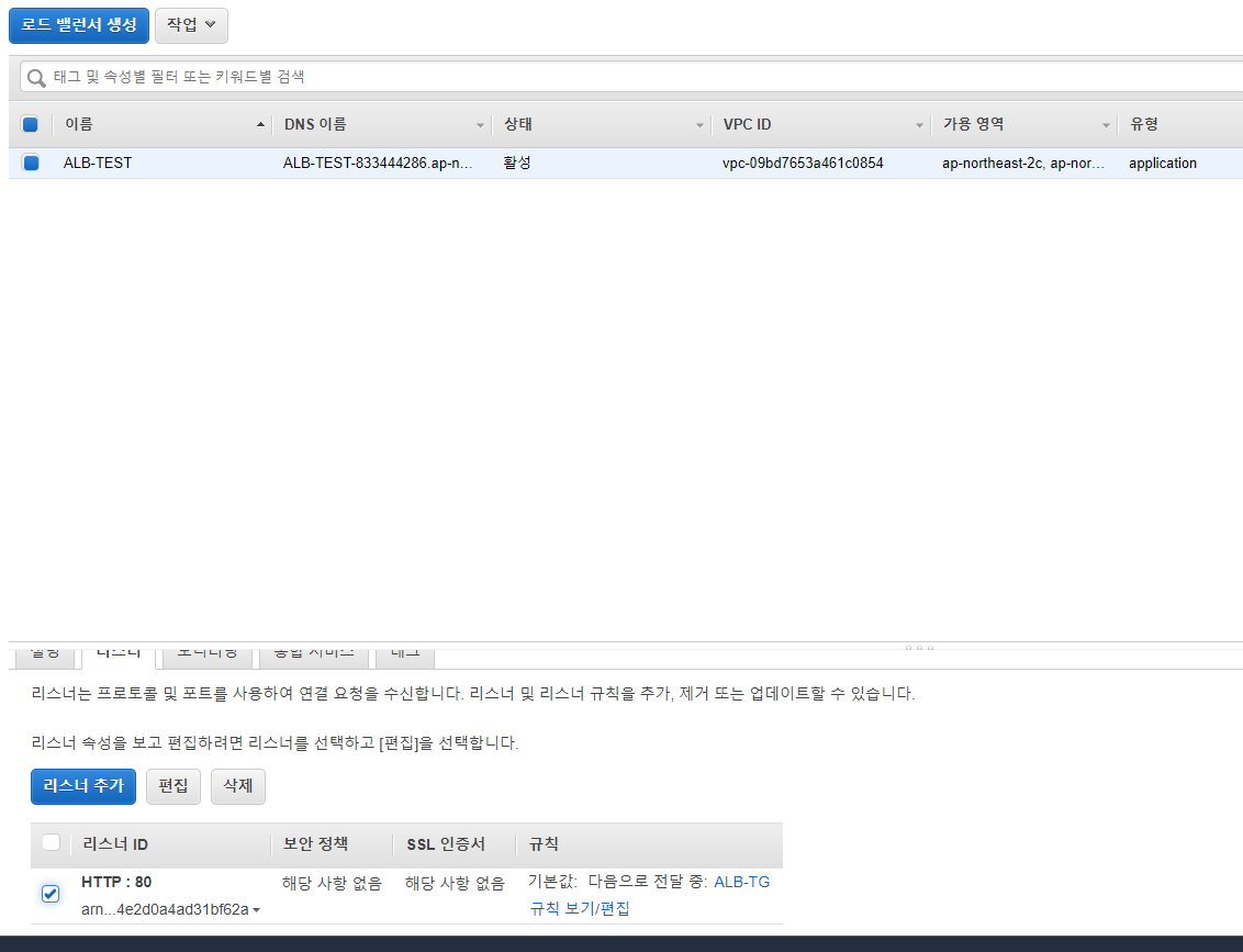 로드 밸런서 ALB-TEST에서 기존의 리스너를 편집해줍니다. ( 규칙 보기/편집 클릭)