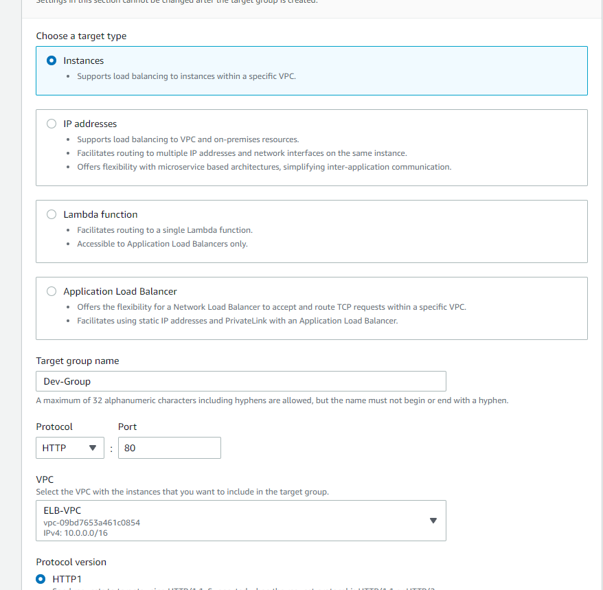 [EC2 - 로드 밸런싱 - 대상 그룹 - 대상 그룹 생성] 으로 들어가서 Dev-Group이라는 이름의 대상 그룹을 생성해줍니다. VPC는 ELB-VPC로 합니다. 대상을 등록하는 페이지에서 /dev/ 경로 페이지가 존재하는, ELB-EC2-1만 선택하여 대상으로 등록해줍니다. 같은 방식으로 ELB-EC2-2만 대상으로 등록되있는 Mgt-Group도 생성해줍니다.