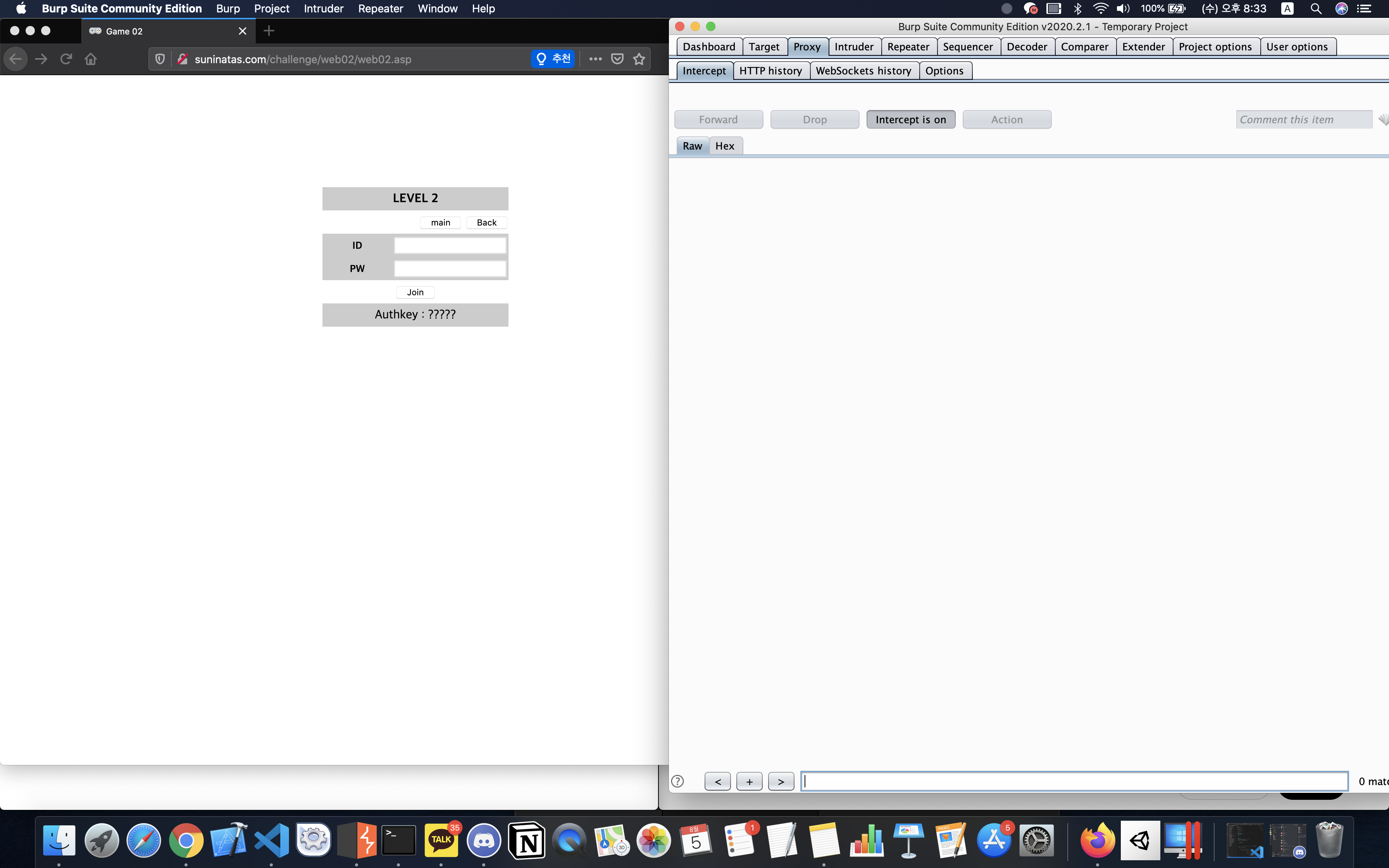 모든 준비 완료,,,여기서 왼쪽 브라우저에 다른 값을 넣고 Join을 누르고 오른쪽 BurpSuite에서 그 전송을 캐치해서 값을 바꾸고 다시 보내줄 것이다! 해보쟈