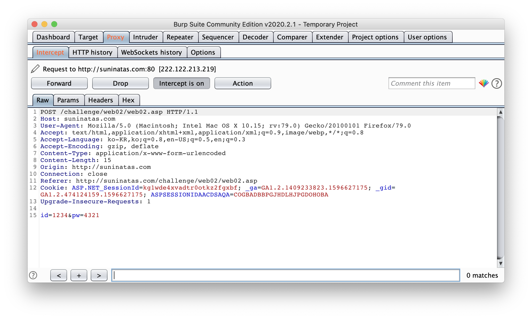 id와 pw에 각각 1234와 4321을 넣었더니 위와 같이 Burp Suite에 잡혔다. 밑에 id와 pw 값을 조절해보자!