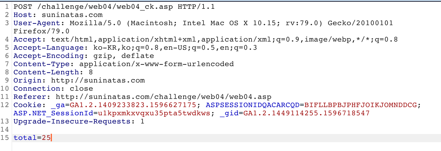 포인트가 25일때 서버로 가는 데이터를 인터셉트! 하면 위와 같이 뜬다. 아래의 total이 포인트 점수일 것이고, 우리는 User-Agent를 건든다.