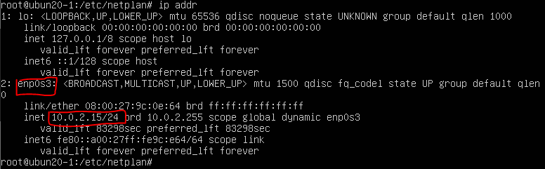 여기서, 빨간색 네모에 적힌 정보를 확인합니다. 고정 IP를 할당할 네트워크 인터페이스(ex. enp0s3)와 현재의 IP 주소(ex. 10.0.2.15/24).