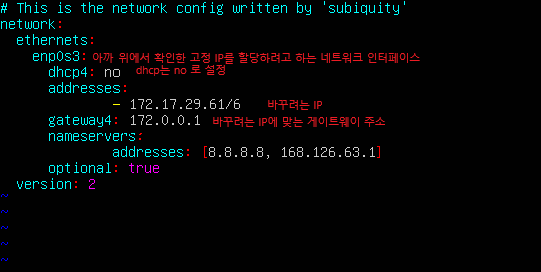 일반적으로 파일을 편집기로 열어보면, 위와 같이 DHCP 로 설정이 되어있습니다. 이를 편집해서 원하는 IP를 할당해보겠습니다. 저는 172.17.29.61 이라는 IP 주소로 할당하려고 합니다.