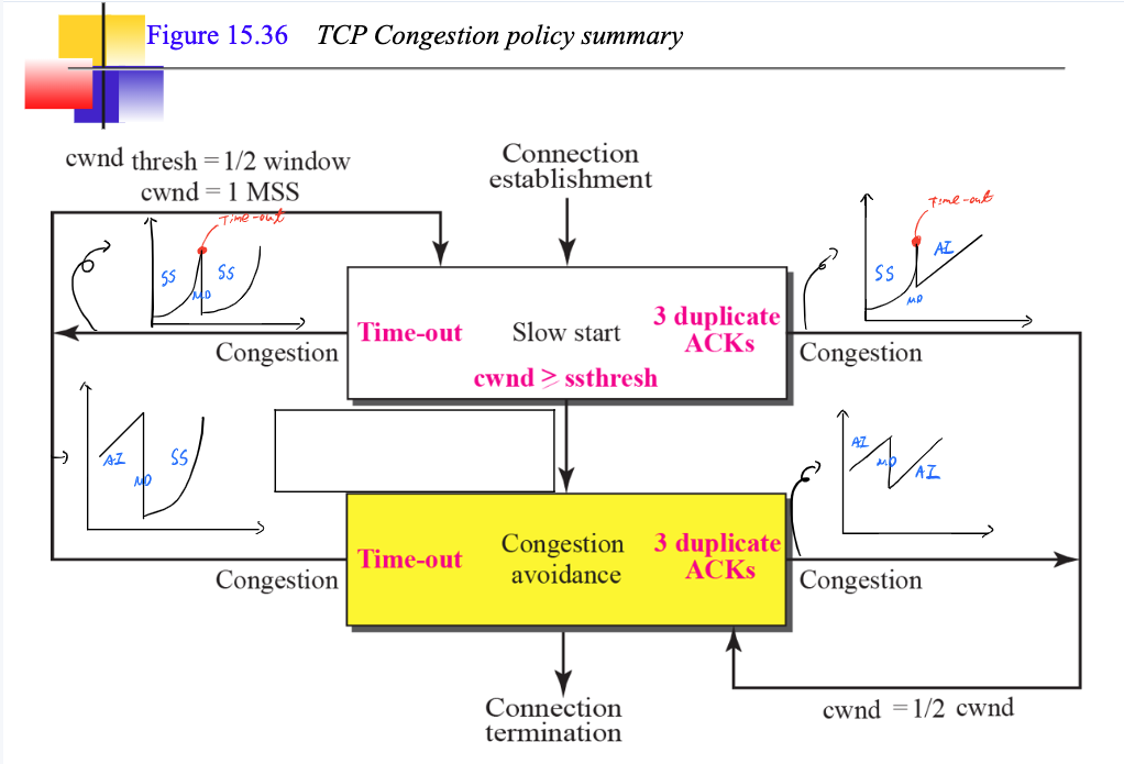 TCP는 Time-out 혹은 3 Duplicative Acks와 같은 혼잡 상황을 detect하여 상황에 맞게 Slow Start(SS), Addictive Increase(AI), Multiplicative Decrease(MD)와 같은 과정들을 거치게 됩니다. 바로 이 전체 과정을 Congestion control, 혼잡 제어라고 합니다.