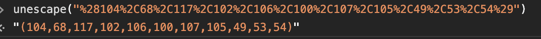 String.fromCharCode%2528104%252C68%252C117%252C102%252C106%252C100%252C107%252C105%252C49%252C53%252C54%2529 이다. 저 뒤에 주어진 %2528~ 이게 뭔지 모르겠어서 unescape 함수에 넣어보았다. 그랬더니 아래와 같이 나왔다.