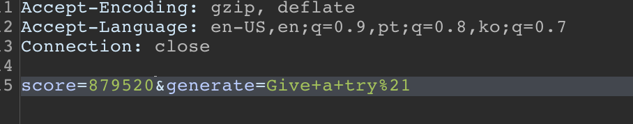 Give it a try! 버튼을 누르자 버프수트에 다음과 같은 데이터가 잡혔다. 살펴보니,,, 점수를 POST 방식으로,,,하는구나? 그럼 이걸 999999보다 큰 숫자로 바꿔보자